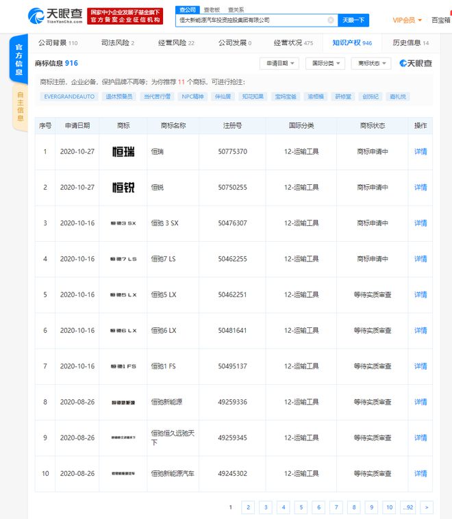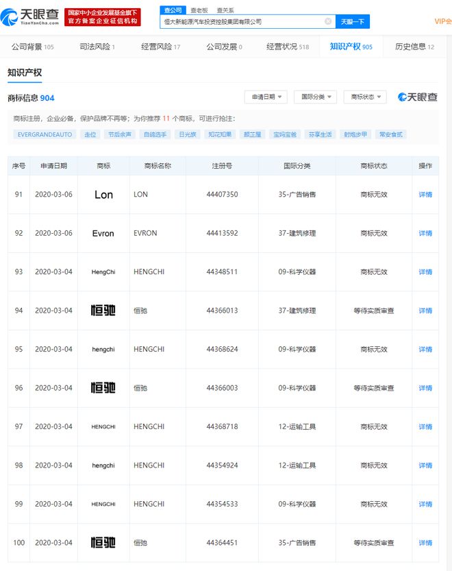 天眼查App显示,10月16日,恒大新能源汽车投资控股集团有限公司申请了多个商标名称为“恒驰3 SX”、“恒驰7 LS”、“恒驰5 LX”、“ 恒大恒驰汽车”、“ 恒驰恒久远驰天下”等商标,商标国际分类为运输工具,商标状态为商标申请中。此外,今年3月4日,该公司申请注册“恒驰”、“HENGCHI”商标,国际分类涉及运输工具、广告销售等。另外,2019年,该公司还申请注册了恒马、恒智、恒优、恒电、恒冠、恒坤等商标。