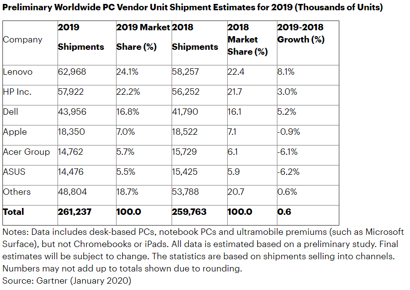 Gartner 2019年全球PC出货量数据(单位为千台)