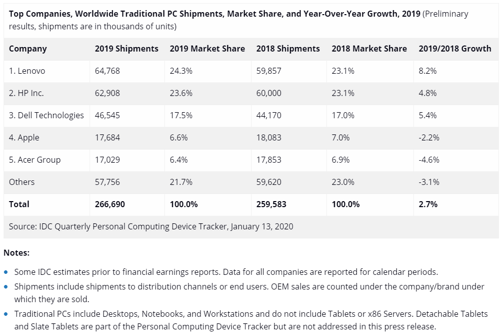 IDC 2019年全球PC出货量数据(单位为千台)