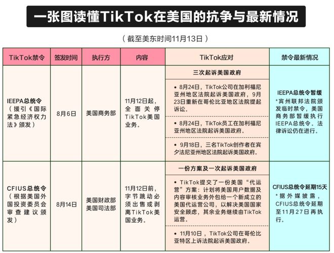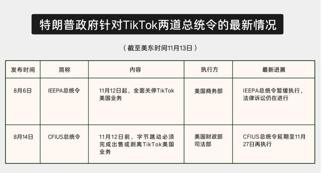 报道称,当地时间11月13日,TikTok在一份法庭文件中表示,美国外国投资委员会(CFIUS)批准其延长原定于周四(11月12日)生效的禁令期限至11月27日,以达成解决方案。TikTok拒绝对这份文件发表评论。
