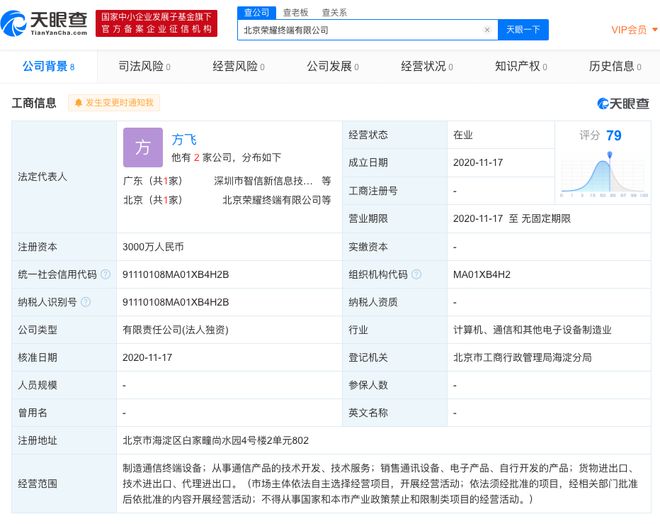 天眼查App显示,11月17日,深圳市智信新信息技术有限公司对外投资新增一家公司——北京荣耀终端有限公司。