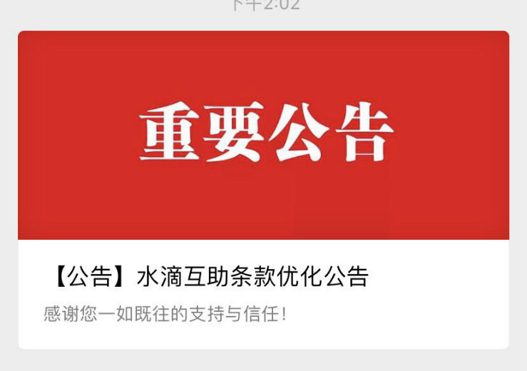 水滴互助条款优化公告 来源:水滴互助微信公众号